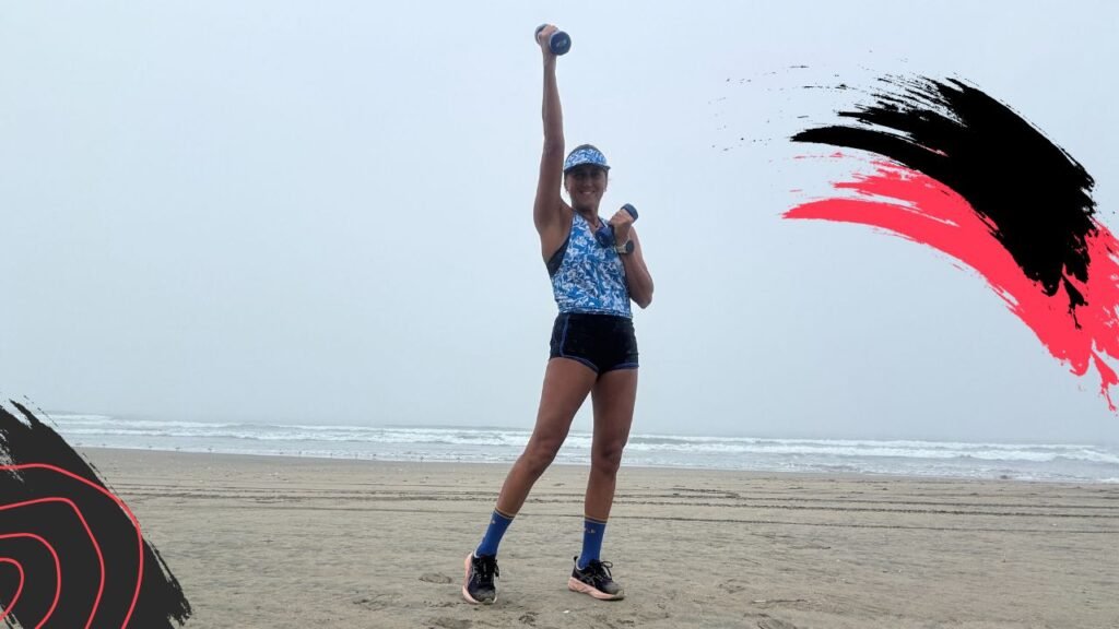 Susana hoy aprovecha el verano y realiza una clase de aeróbicos en la playa, con mancuernas...